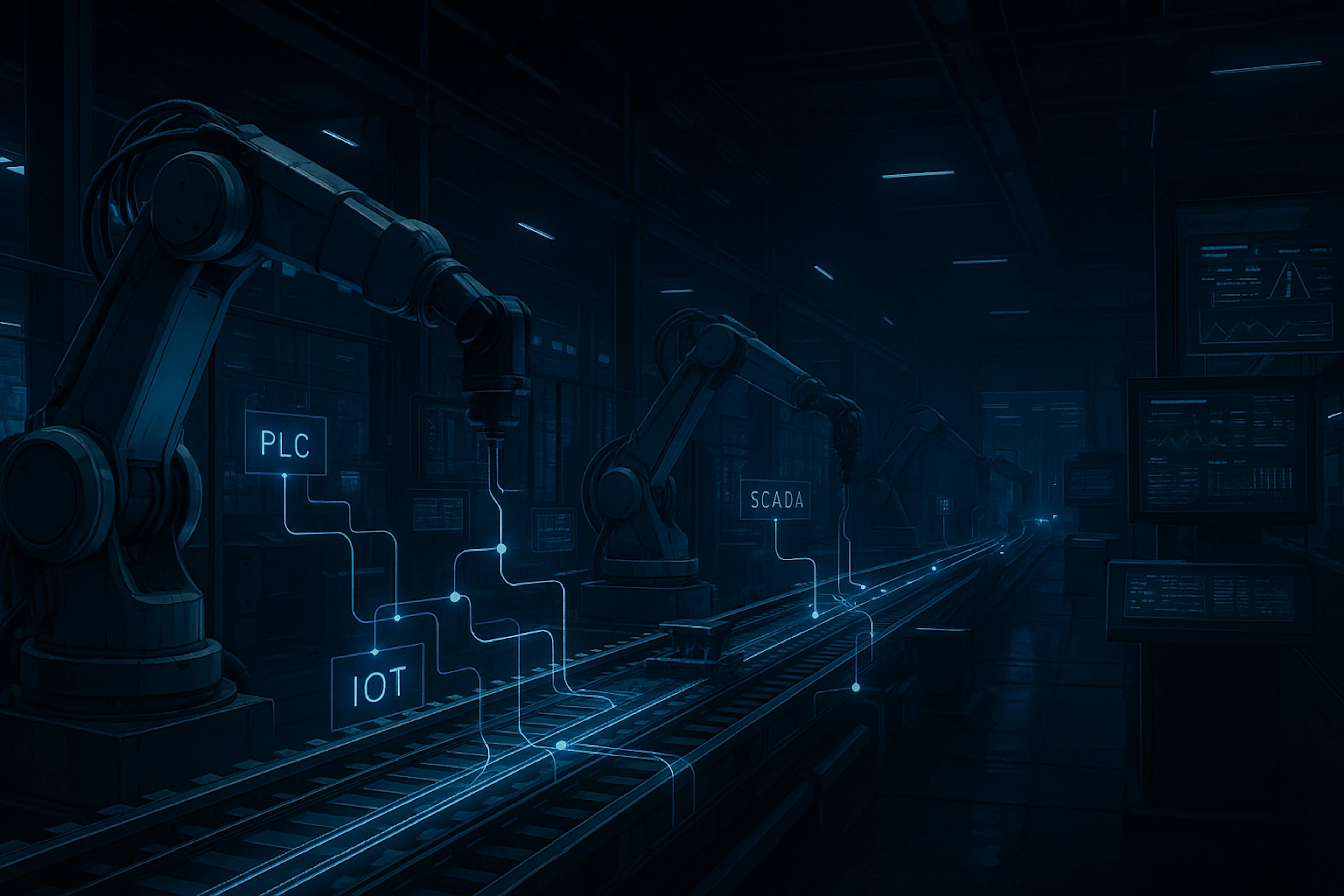 PLCs steuern Maschinen, SCADA-Systeme überwachen Prozesse, BMS-Plattformen steuern HLK und Energie, IoT-Sensoren erfassen Zustände und Zutrittskontrollsysteme melden Aktivitäten.